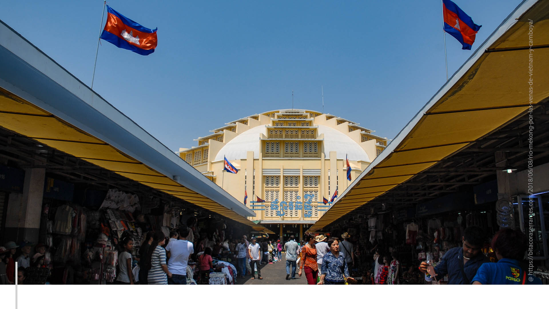 Como una nave espacial de amarillo intenso aparece en el panorama de la ciudad de Nom Pen el Mercado Central, una joya del art déco diseñada por el francés Louis Chauchon en 1937. Filas de banderas camboyanas guardan la entrada principal, adornada con letras azules que en lengua jemer dicen “Phsa Thmei”. En su interior, igual de amarillo, unos ventiladores intentan disipar el calor y un hermoso reloj de cuatro caras, bajo el domo central, da la hora a cada una de las cuatro alas de la estructura en cruz. Allí dentro hay puestos de comida, ropa, relojes y electrónicos; y en la parte exterior, pescado, carne, verduras y exóticas frutas que tienes que probar. Para hacer de esta experiencia algo más auténtico, se recomienda llegar en mototaxi.