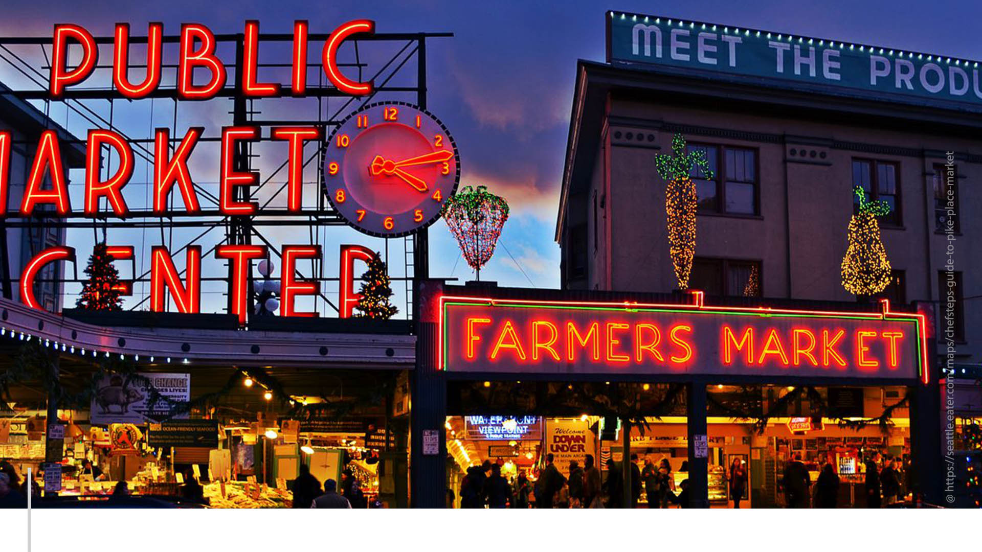 A pocos metros del muelle que bordea la bahía de Elliott se encuentra uno de los mercados más antiguos de Estados Unidos, el Pike Place Market, lleno de íconos: el letrero rojo de neón que lee “Public Market Center”, en una tipografía impecable, junto a un reloj; Rachel, la puerquita de bronce que custodia la entrada principal; el lema del mercado “Meet the Producer” (conoce al productor) que se ve en otro letrero y que resume su carácter orgánico y de comercio justo; el salmón volador que se lanzan los vendedores en la sección de pescados, antes de vendértelo; el primer Starbucks nació allí en 1971 y —¡cómo olvidar!— los músicos callejeros que amenizan tu recorrido.