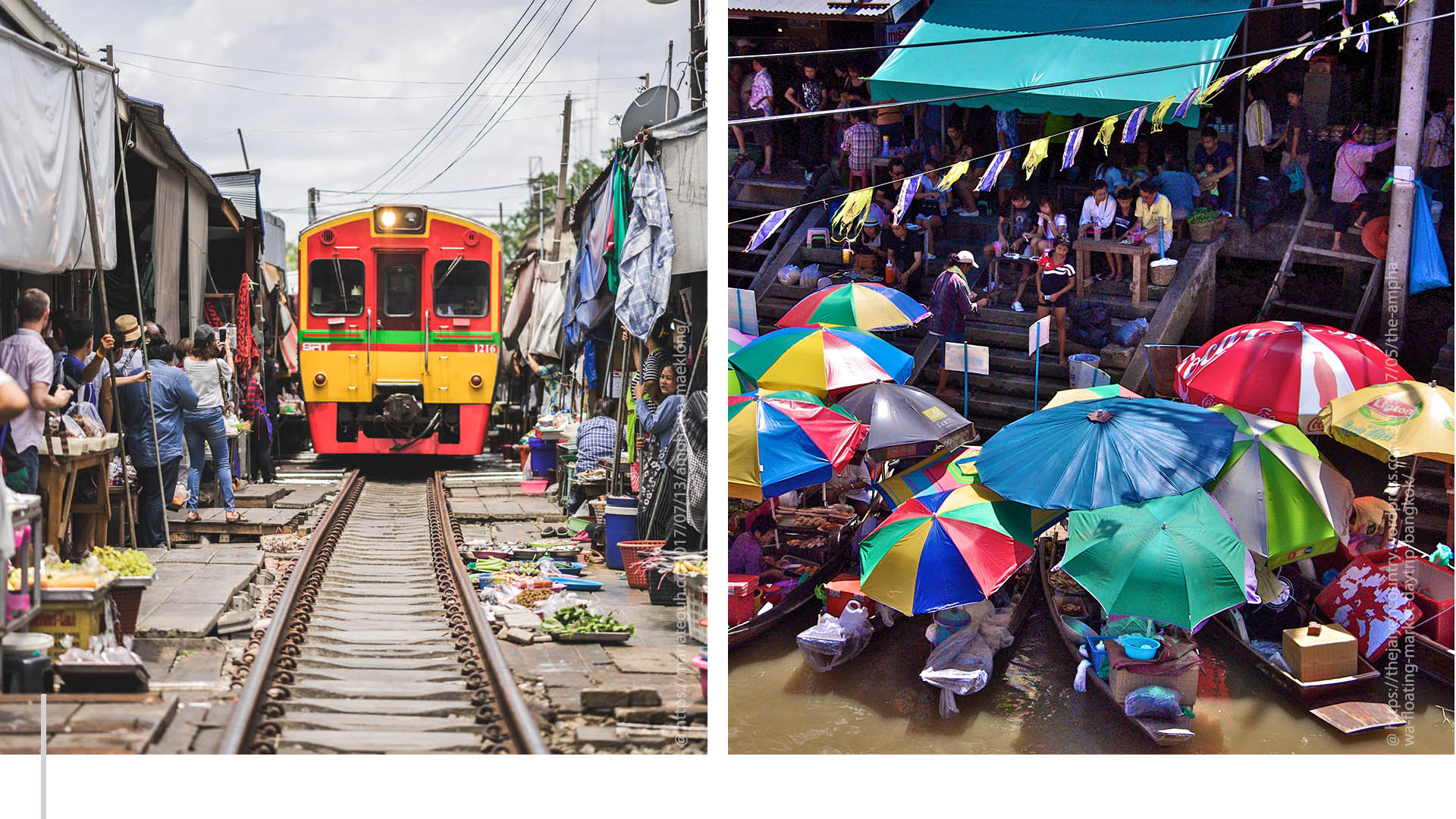 Dos mercados en una visita ya que están a tan sólo 10 minutos en coche. Amphawa es un mercado flotante, es decir, los puestos de productos agrícolas y comida son en realidad botes. Este particular tipo de comercio surgió en Tailandia en el siglo XIV y también se ve en Vietnam y Malasia. Merece la visita por ser uno de los más tradicionales y aún no tan turístico. Por otra parte el mercado de Maeklong es aún más único y curioso debido a que está en la mitad de una línea férrea y sus locales deben abrir paso al tren cada vez que éste pasa. Es tan surreal que incluso algunas bandejas con verduras quedan cubiertas, a pocos centímetros, por los vagones.