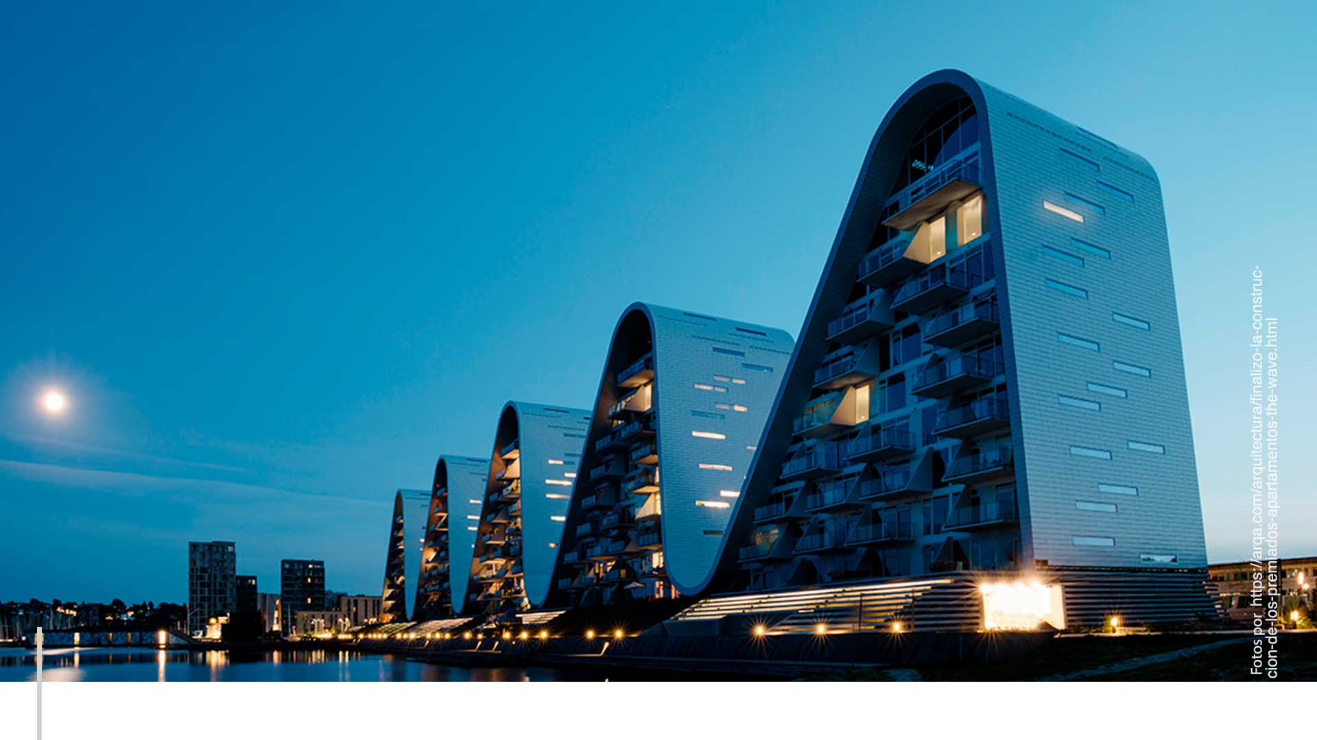 El edificio es un complejo de departamentos que se encuentran frente al mar en Vejle. Diseñado por Henning Larsen Arquitects, tiene forma de oleaje que cubre el muelle. Las olas de concreto están conectadas a través de un mismo piso. (Muy bonito y todo, pero se ha de sentir muy extraño vivir aquí.)